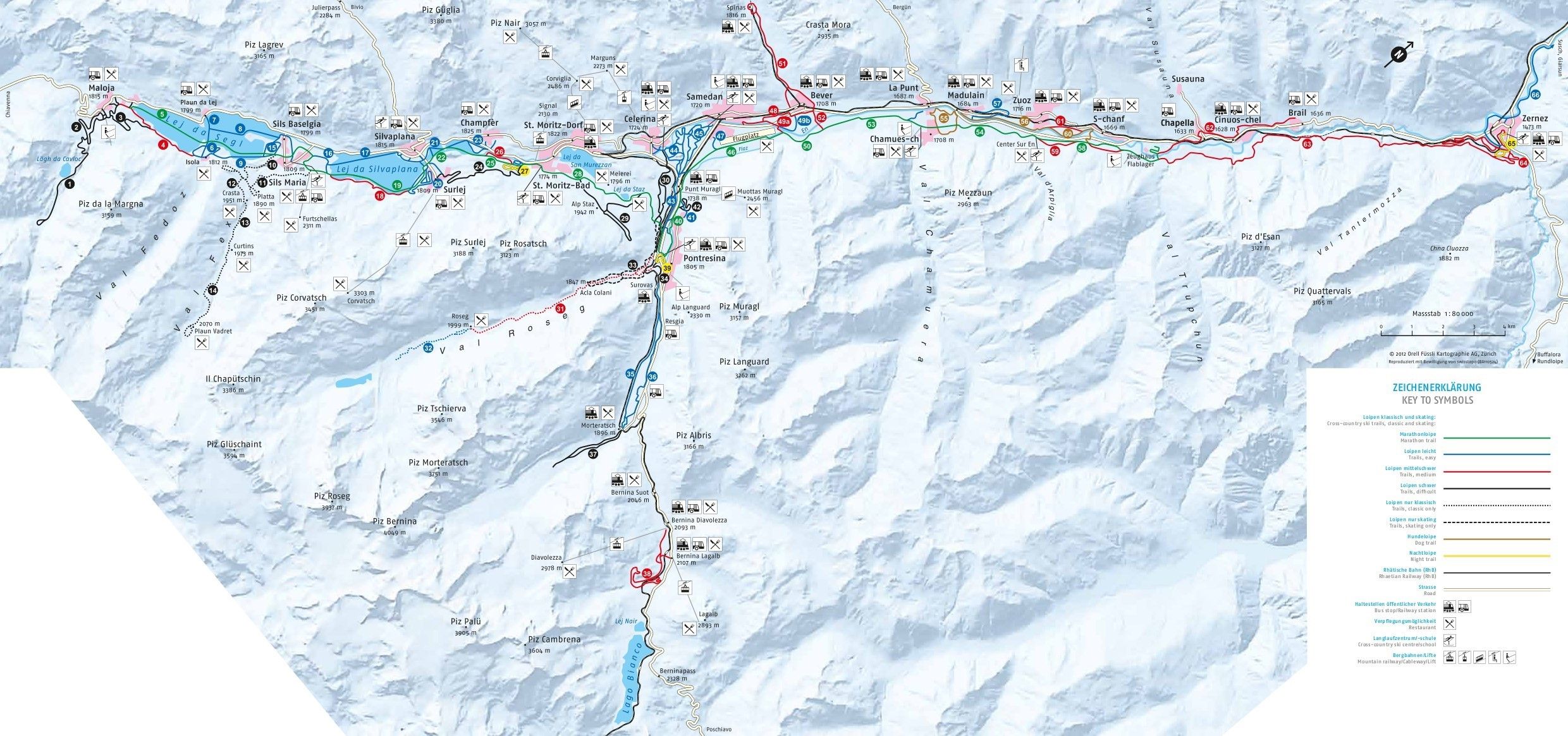 Besonders hervorzuheben ist die wohl berühmteste Loipe der Schweiz, die 42 km lange Marathonstrecke zwischen Maloja und S-chanf. Auf dieser Strecke findet jährlich am zweiten Sonntag im März das Langlauf-Großereignis des Jahres statt, der Engadin Skimarathon, an dem mehrere Tausend Langläufer teilnehmen. Die wohl schönste Aussicht bieten die Höhenloipen. Hier ist die mittelschwere Loipe "Alp Bondo" zu empfehlen, die von 2.093 bis 2.200 m reicht und sich über 8 km erstreckt, ebenso wie die Höhenloipen bei Maloja und Silvaplana. Wer auch spät abends die Loipe noch nicht verlassen möchte, für den stehen drei Fluchtlichtloipen, zum Beispiel die 2 km lange Nachtloipe bei St. Moritz, zur Verfügung.